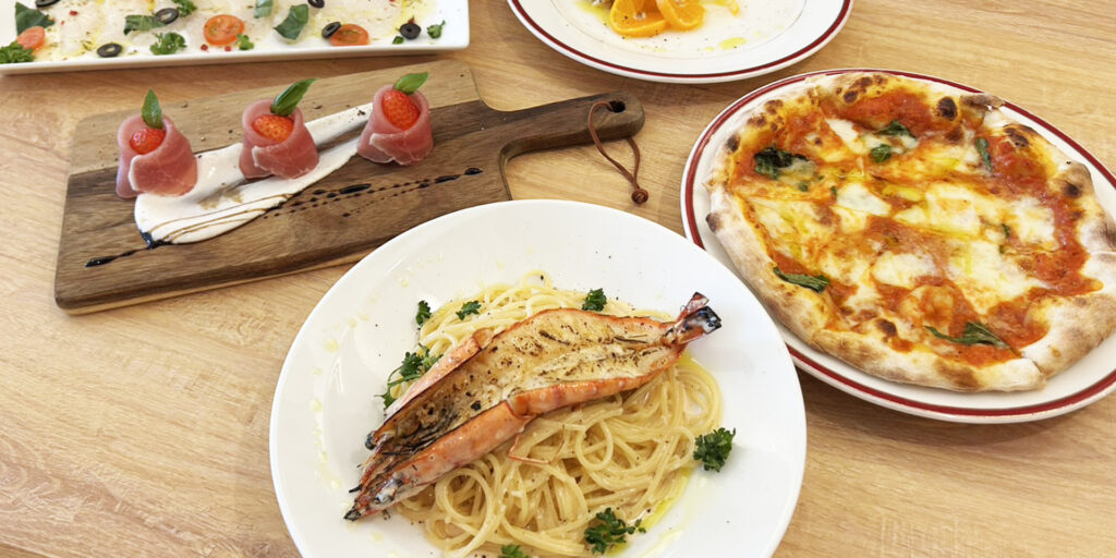 錦江湾の魚介や鹿児島の食材を取り入れ、前菜からパスタ、ピザ、メイン料理まで豊富にご用意しています。